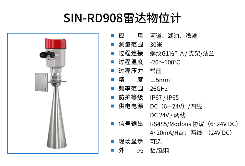 聯(lián)測SIN-RD908雷達(dá)液位計0-30米水位,雷達(dá)液位計天線發(fā)射及窄的微波脈沖,這個脈沖以光速在空間傳播,遇到被測介質(zhì)表面,其部分能量被反射回來,被同一天線接收。發(fā)射脈沖與接收脈沖的時間間隔與天線到被測介質(zhì)表面的距離成正比,多用于水位、料位與化工場合。